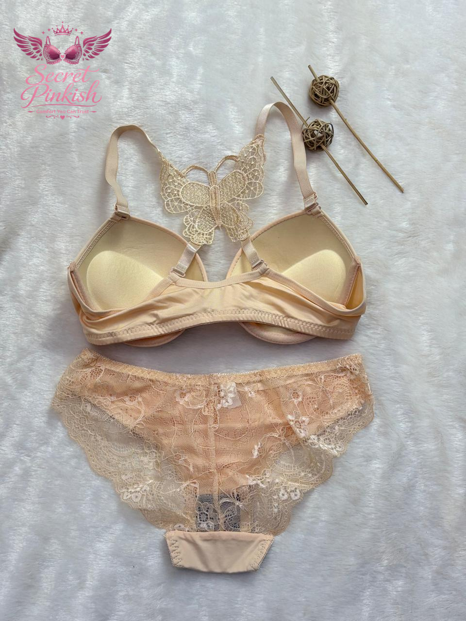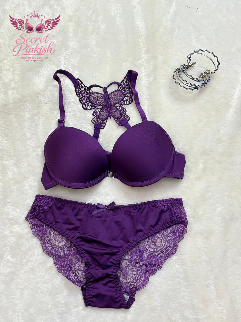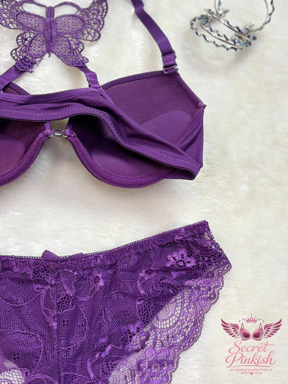 Turn up the charm with our Butterfly Lace Racerback Bra & Panty Set. Featuring a beautifully embroidered butterfly lace design on the back and a deep plunge push-up front, this set offers the perfect balance of sexy and supportive. The matching lace panties complete the look, making it an elegant and irresistible lingerie duo.